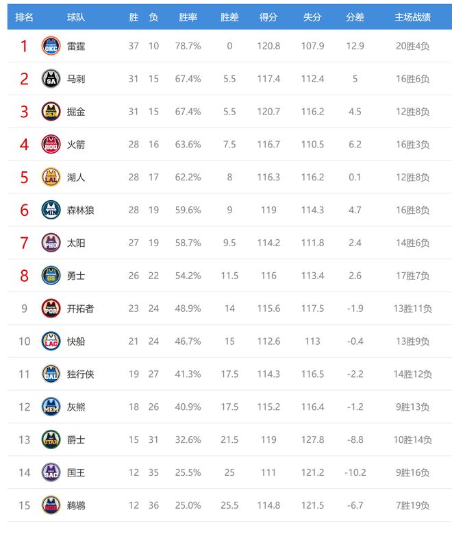 今日比賽后太陽、森林狼排名互換,灰熊、獨行俠排名互換,其他西部球隊排名不變。