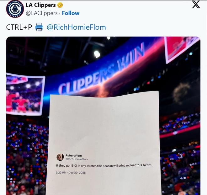 快船對陣籃網的比賽時,不少球迷紛紛想起了弗洛姆的這條推文。快船隊官方也記著這件事,終場哨聲一響,球隊便立刻在社媒上發文回應,并附上了一張在英格爾伍德體育館內拍攝的推文打印稿照片。