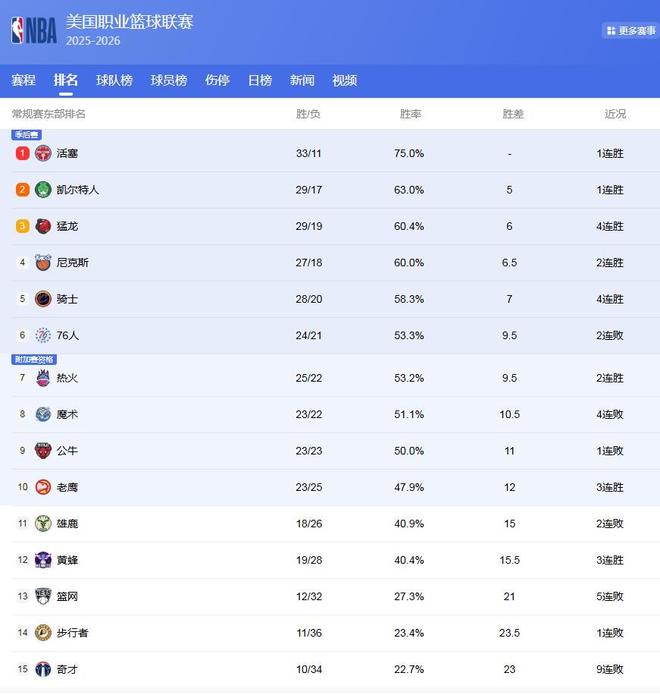 東部最新排名: