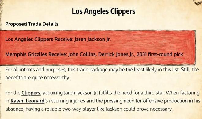 美媒《Fadeaway World》撰文建議,快船可以考慮將科林斯、小瓊斯以及2031年的首輪簽送到灰熊,引入小杰克遜。