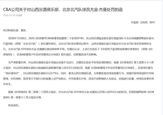 最后CBA反而處罰了杰曼:10號球員尤金·杰曼隨后做出侮辱性手勢,處以罰款人民幣3萬元的處罰。在隊友被欺負的情況下,杰曼只是做出了手勢,這就被罰款了?這不是在比賽中,已經處于賽后了,這樣的處罰也很莫名其妙。