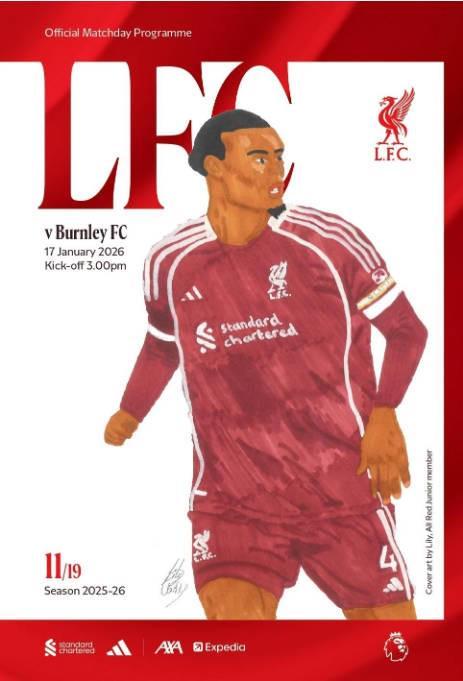 根據(jù)利物浦官方的公告,俱樂部的“全紅(All Red)”會員計劃舉辦了一場比賽,讓所有16歲以下的青少年會員有機會設(shè)計節(jié)目的封面,在120多份參賽作品中,莉莉(Lily)的創(chuàng)作獲勝,她還贏得了兩張招待券。