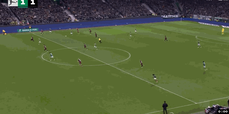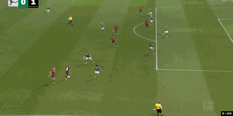 開場僅1分鐘,法蘭克福后場左側(cè)大范圍轉(zhuǎn)移到前場右側(cè),日本球員堂安律插上將球卸下,堂安律帶球推進(jìn)到禁區(qū)前沿斜吊禁區(qū)左側(cè),布朗倒三角搶點(diǎn)頭球擺渡頂?shù)街新罚ɡ锬范鞫嘈〗麉^(qū)前沿?cái)D開防守球員搶點(diǎn)右腳外腳背凌空一撩,皮球直入球門左側(cè)死角,法蘭克福1:0取得夢幻開局。第19分鐘,不萊梅后場斷球反擊,斯塔格送出精妙直塞,金馬高速插上禁區(qū)弧頂處拿球獲得半單刀良機(jī),只是他未能把握機(jī)會,大力低射稍稍偏出門柱。