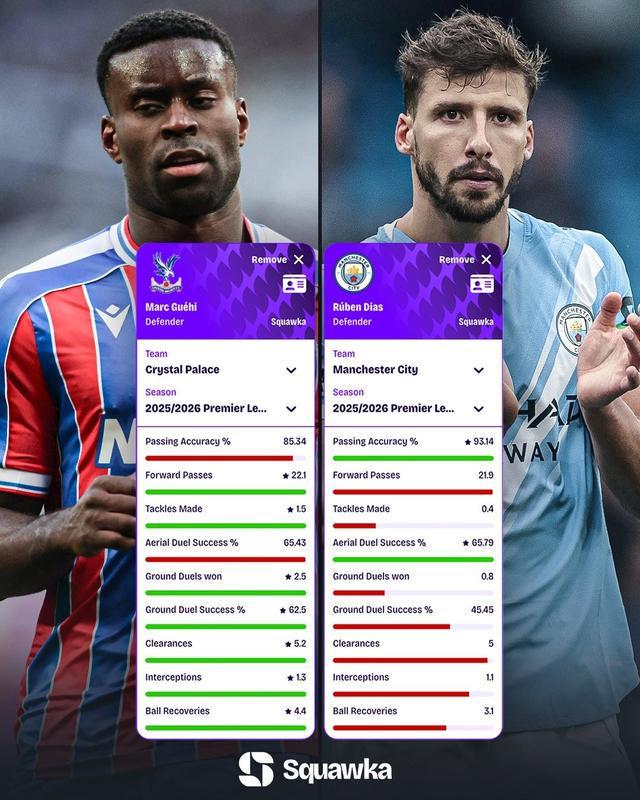 北京時(shí)間1月19日,在曼城官宣他們引進(jìn)水晶宮隊(duì)長格伊之后,知名數(shù)據(jù)機(jī)構(gòu)Squawka對比了格伊與魯本-迪亞斯本賽季至今的英超場均數(shù)據(jù)。