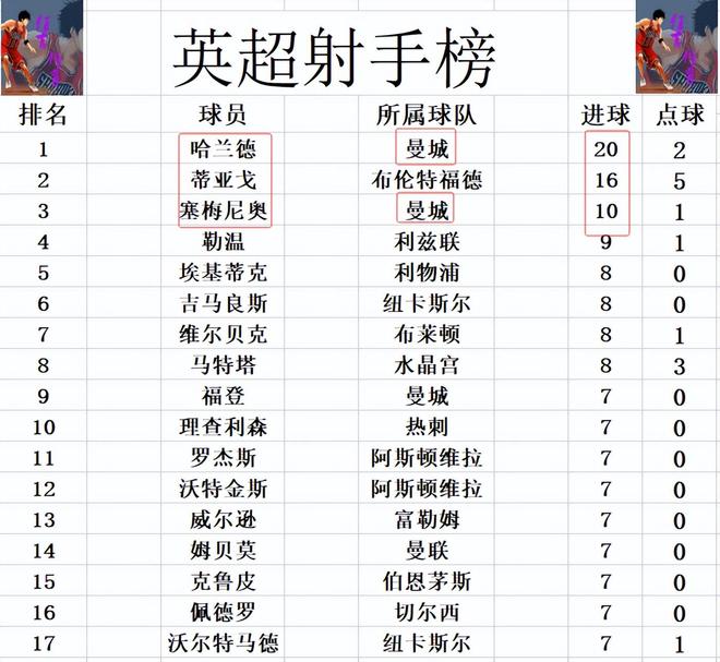 射手榜方面,哈蘭德20球領跑,蒂亞戈16球位列第2,塞梅尼奧10球排在第3。勒溫9球排第4,福登,理查利森,姆貝莫和沃特金斯等人7球剛好擠入前十。