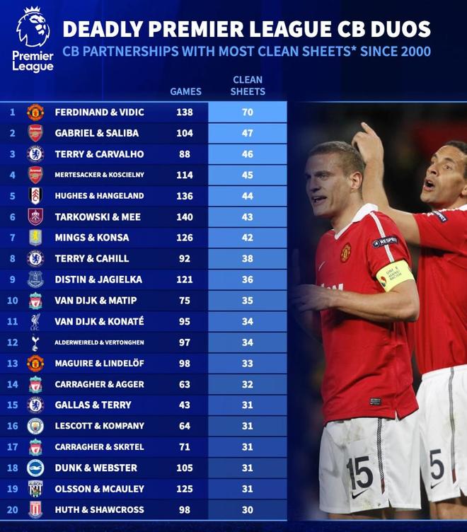 北京時間1月20日,德轉列出了自2000年以來英超首發中衛搭檔零封次數榜,曼聯的里奧-費迪南迪和維迪奇以138場比賽零封70次斷檔領先,阿森納的加布里埃爾和薩利巴47次零封第二,切爾西的特里和卡瓦略46次零封第三。