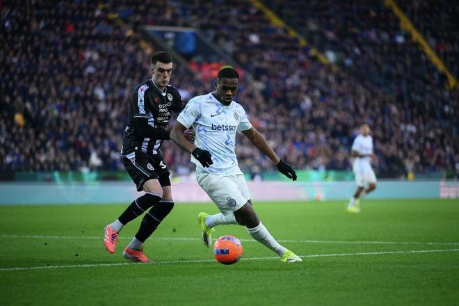 因為進(jìn)球時間早,而且一球的優(yōu)勢也并不保險,所以國米的進(jìn)攻強(qiáng)度并沒有馬上下降。第28分鐘就有一次差點擴(kuò)大比分的進(jìn)攻出現(xiàn),勞塔羅左路持球推進(jìn)后橫傳中路,插上的迪馬爾科接球后不作調(diào)整直接遠(yuǎn)射,這腳射門質(zhì)量極高,但烏雞門將奧科耶也做出了漂亮撲救,將皮球拒之門外。
