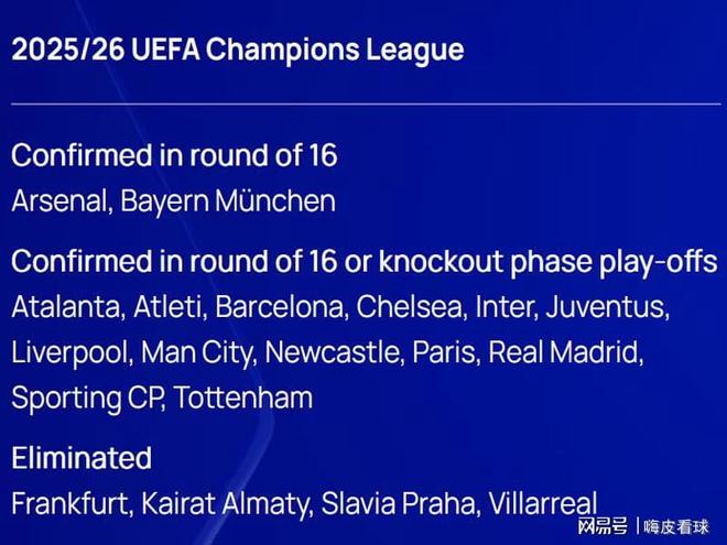 另外還有13支球隊提前出線,至少可以獲得16強附加賽的資格,包括英超的利物浦、熱刺、紐卡斯爾、切爾西和曼城,西甲的皇家馬德里、巴塞羅那和馬德里競技,意甲的亞特蘭大、國際米蘭和尤文圖斯,法甲的巴黎圣日耳曼,以及葡超的葡萄牙體育。