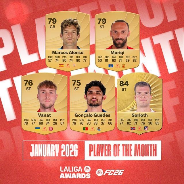 北京時間1月22日,西甲1月最佳球員候選名單公布,這5名球員為馬科斯-阿隆索、穆里奇、瓦納特、貢薩洛-格德斯、瑟洛特。