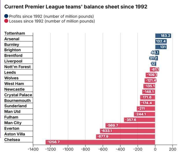據(jù)《郵報(bào)》報(bào)道,英超時(shí)代各俱樂部累計(jì)虧損總計(jì)已超49億鎊,只有熱刺、阿森納和利物浦等隊(duì)實(shí)現(xiàn)盈利。自1992年以來,英超俱樂部總共虧損達(dá)到了49.9億英鎊,其中90%由10家俱樂部貢獻(xiàn)。切爾西是虧損最多的,他們英超時(shí)代的虧損超12億英鎊,主要在阿布時(shí)代。此外,維拉虧損了6.779億鎊,埃弗頓虧損6.331億鎊,曼城虧損也達(dá)到了5.697億鎊。曼聯(lián)虧損為2.441億鎊。自1992年以來,曼城每虧損2600萬英鎊就能贏得一座獎(jiǎng)杯,切爾西每虧損4500萬英鎊就能贏得一座獎(jiǎng)杯。熱刺盈利最多,但他們?cè)诖似陂g只贏得了兩座聯(lián)賽杯和一座歐聯(lián)杯。如果你以可持續(xù)的成功來衡量一個(gè)俱樂部,那么阿森納就是最可以昂首挺胸的俱樂部。 他們?cè)闻跗鹩⒊?jiǎng)杯,此外還贏得了九座足總杯、一座聯(lián)賽杯和一座歐洲優(yōu)勝者杯,總共盈利1.324億英鎊,盈利僅低于熱刺。利物浦的運(yùn)營一直保持穩(wěn)健,并且實(shí)現(xiàn)了1200萬鎊盈利。1992年以來英超球隊(duì)盈虧排行: