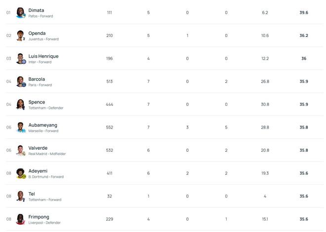 39.6km/h,帕福斯前鋒迪馬塔斷層領先歐冠沖刺速度排行榜