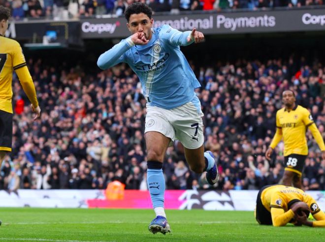 開場之后,曼城就大舉壓上,開啟了傳控的壓迫性打法,狼隊防守有些顧此失彼。第6分鐘,努內斯邊路沒有任何調整,直接傳球,狼隊中衛準備頭球解圍,被馬爾穆什搶先一腳,將球打進。