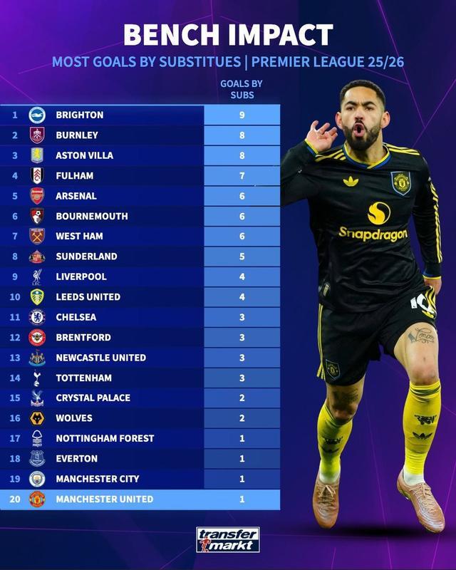 在馬特烏斯-庫尼亞對陣阿森納打入制勝球之前,曼聯是本賽季英超唯一一支替補球員沒有進球的球隊。