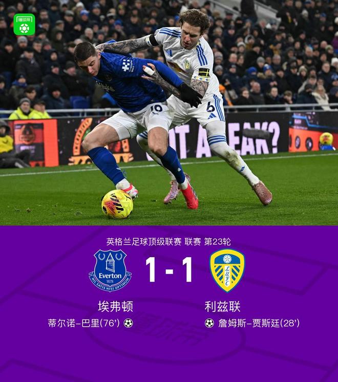 北京時間1月27日,英格蘭足球超級聯賽第23輪,埃弗頓主場對陣利茲聯。利茲聯由詹姆斯-賈斯廷破門得分,埃弗頓隨后由蒂爾諾-巴里破門扳平。最終雙方以1比1戰平。