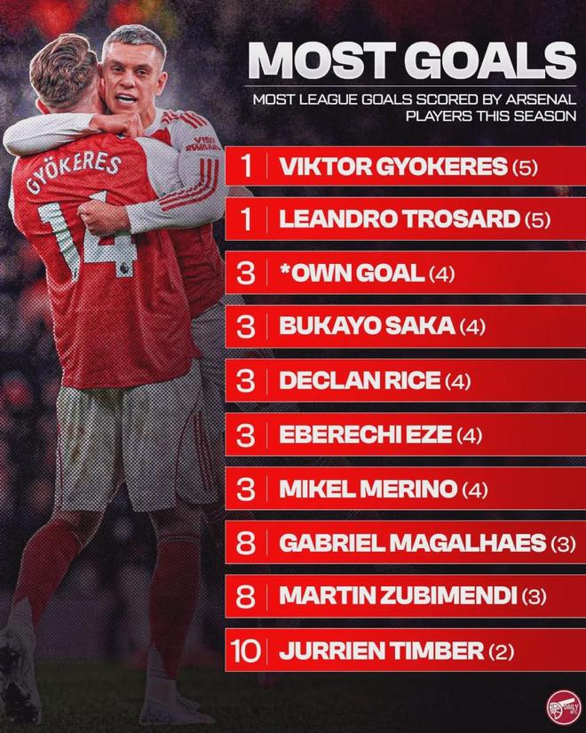 特羅薩德、哲凱賴什5球,賴斯、埃澤、梅里諾、薩卡、烏龍球4球,加布里埃爾、祖比門迪3球,廷貝爾2球。