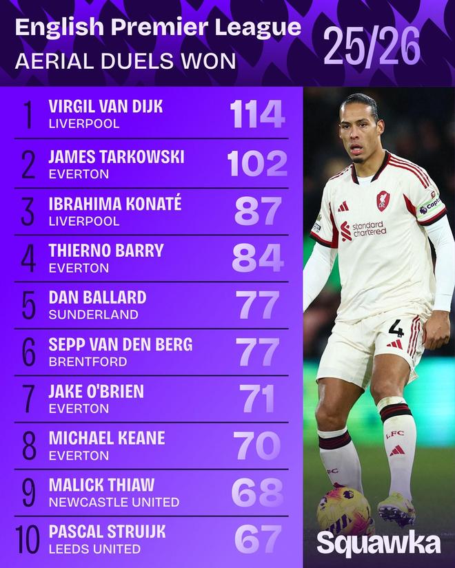 據(jù)統(tǒng)計,范戴克在前23輪英超贏得114次空中對抗,成功率高達(dá)76.5%,均排名第一。